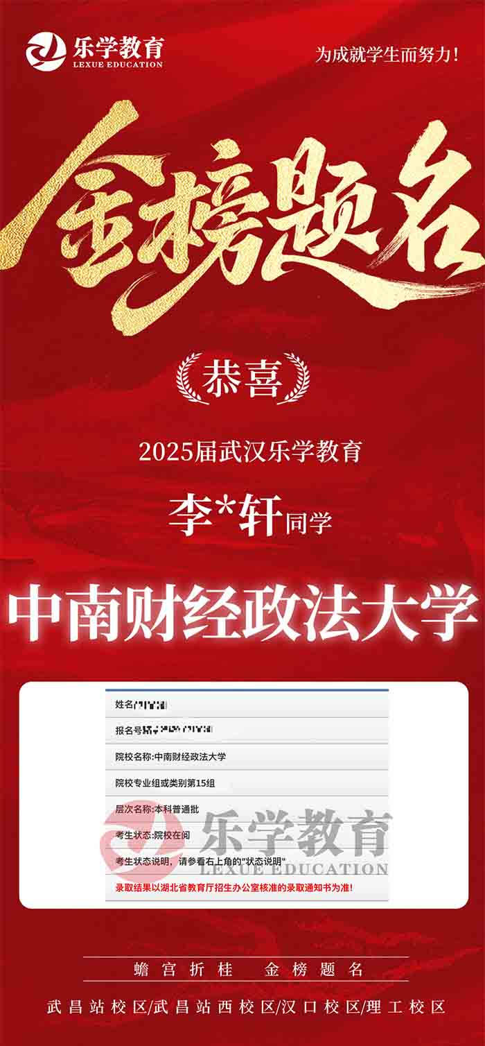 2025届武汉乐学教育 李*轩同学 中南财经政法大学 物理方向619分