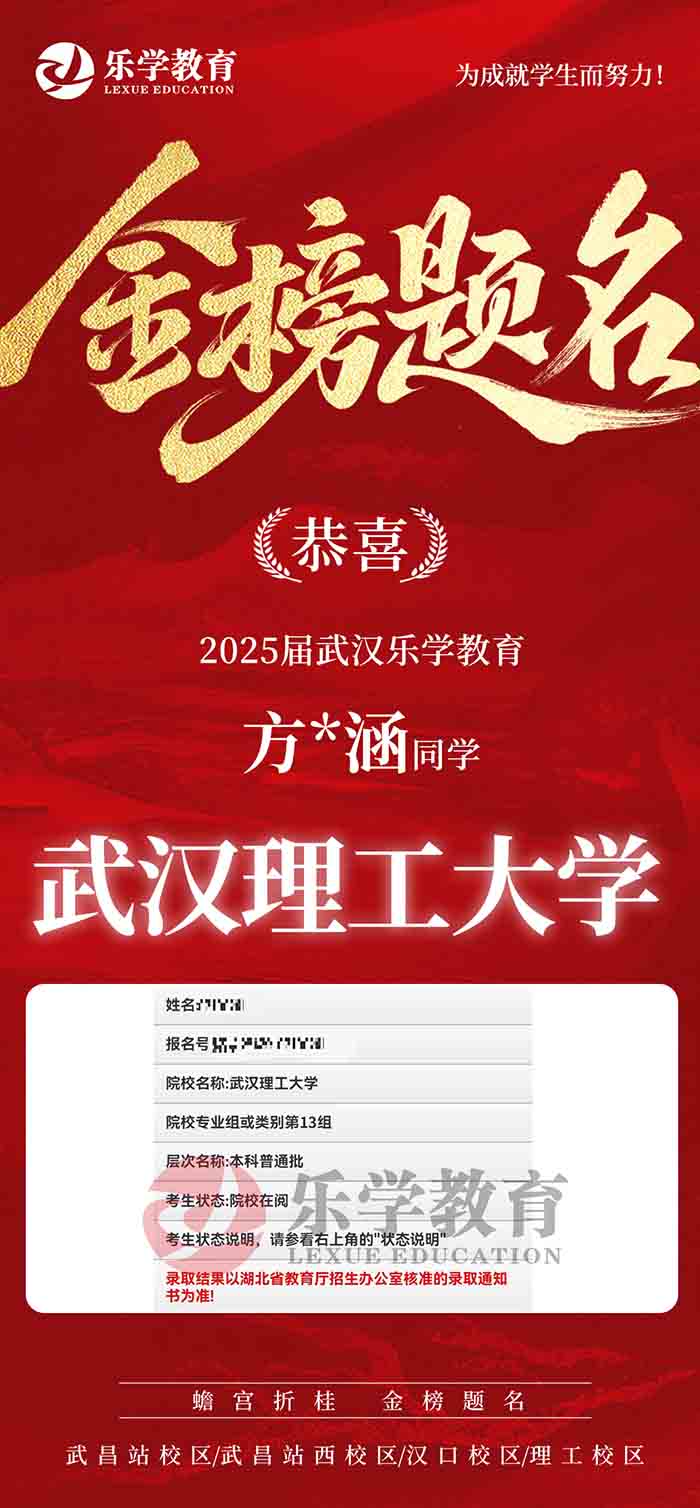 2025届武汉乐学教育 方*涵同学 江南大学 物理方向625分