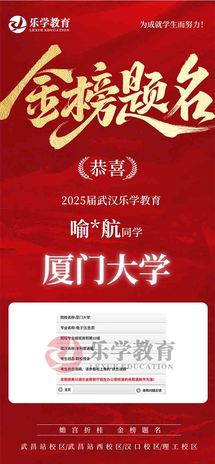 2025届武汉乐学教育 喻*航同学 厦门大学 物理方向627分