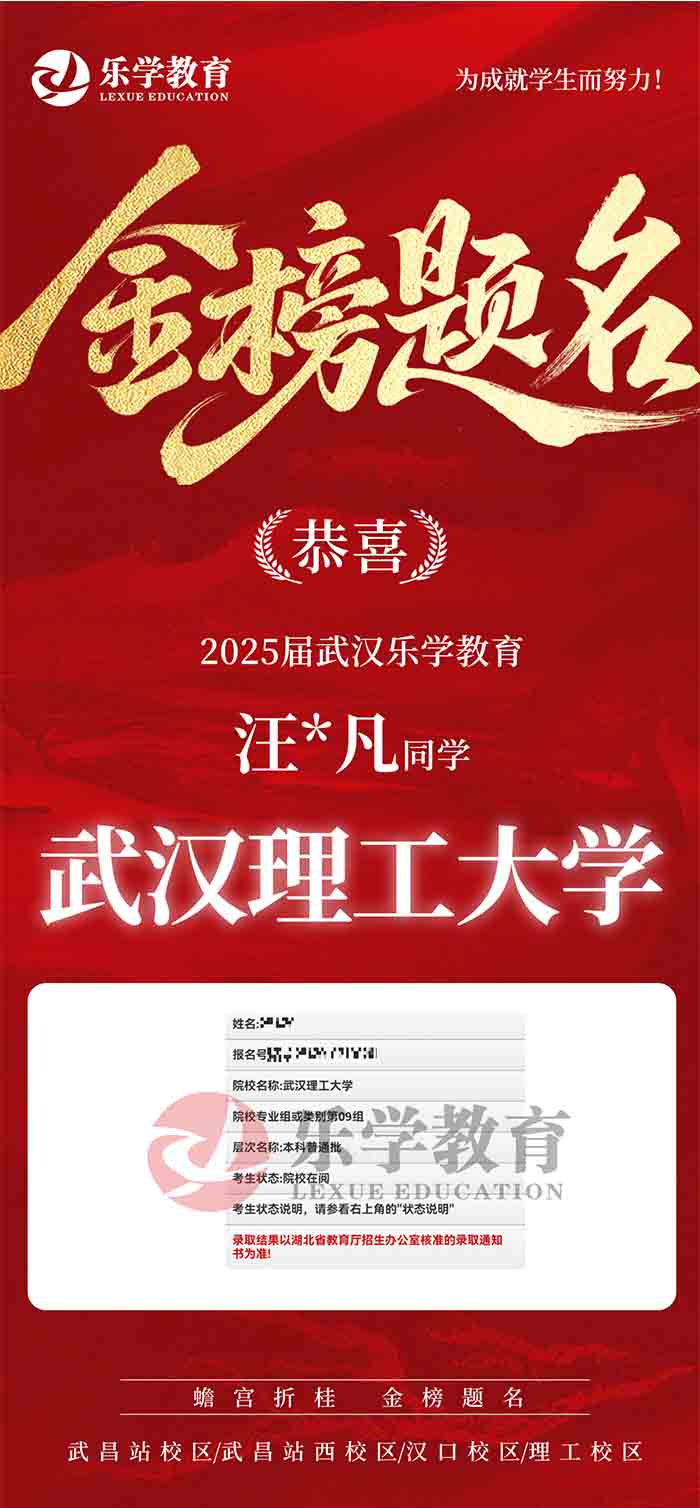 2025届武汉乐学教育 汪*凡同学 武汉理工大学 物理方向632分