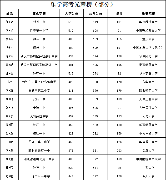 2022乐学学子捷报频传,在全体师生的共同努力下,301位学子参加高考,最高分619分,500分以上47人,450分以上133人,400分以上275人,本科过线率98%。其中卢心怡、李子祺、陈新宇三位同学被中国美术学院录取!吴桐同学被华中科技大学录取!张丽同学被中国地质大学(武汉)录取!段欣妤同学被中南财经政法大学录取......