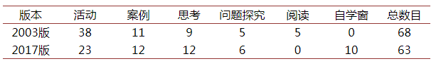 新旧版本教材的作业系统都包括“活动”、“思考”“案例”“问题探究”等栏目。不同的是新版将“阅读”栏目改成为“自学窗”。两版本作业系统所包含的内容如表2所示。